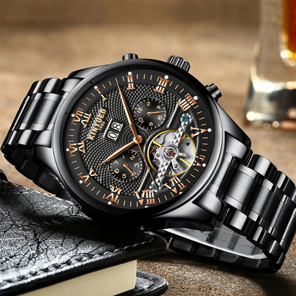This exquisite watch features an extravagant mechanical display with luminous pointers showing time in a luxurious fashion. In addition, the roman numerals and tachymeter bezel perfectly compliments the metal strap offering a fabulous look.